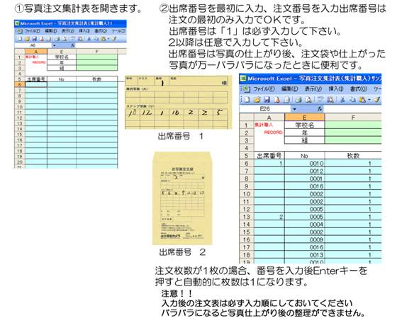 注)注文番号を入力する際に見本にない番号を入力するとプリント作業の時に自動的に削除されるため、写真の順番が詰めて出力されます。集計表入力時にご注意下さい。