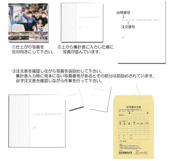 1) 注文受付終了後、受付袋、受付表等をクラス、名簿順に並べ変えることをお勧めします。
